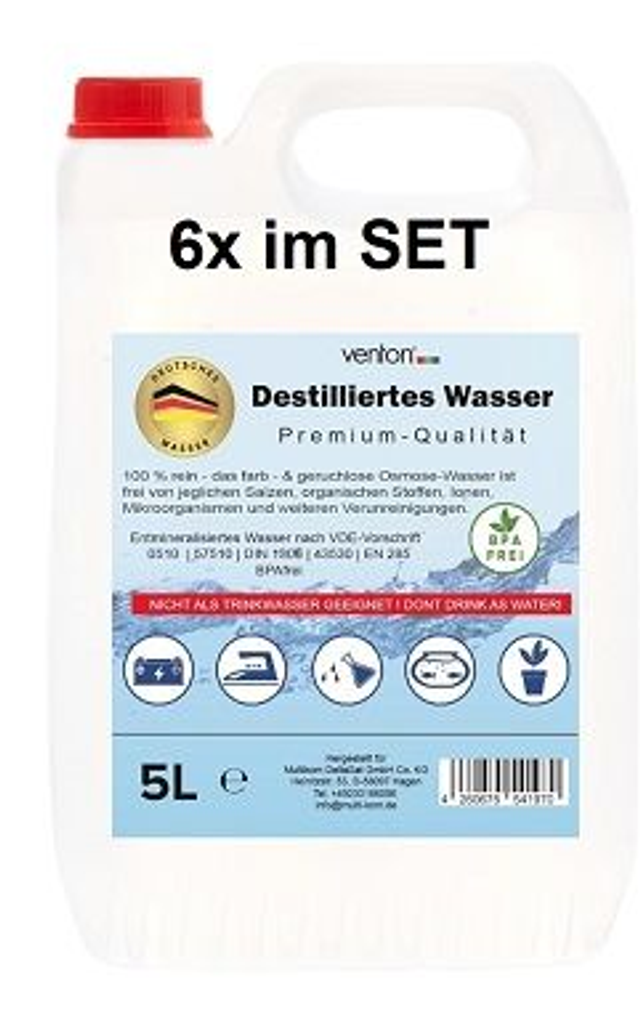 VENTON Destilliertes Wasser 5L I Entsalztes - Entionisiertes - Demineralisiertes Wasser nach VDE 0510 I Dest. Wasser für Haushalt, Freizeit, Auto & Labor I Reines Wasser I Laborwasser